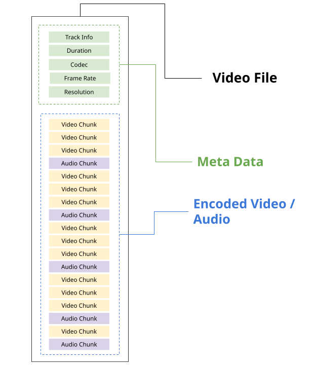 Section titled “Containers”When a video player reads a video file for playback, it needs more info than just encoded video frames and encoded audio, it needs metadata about the video, such as the tracks, video duration, frame rate, resolution, etc..