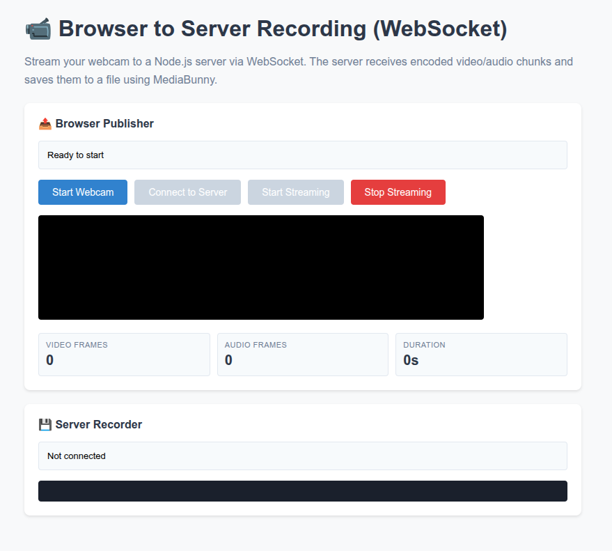 Section titled “Server to Browser”A primary use case for streaming from a browser to a server would be for “recording” features, such as recording a meeting / webinar, or recording high-definition versions of user’s web-cameras, which are common features of meeting, webinar and live-streaming softwares.