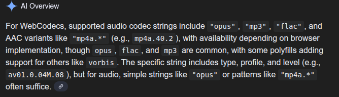 I run a few applications which use WebCodecs [1][2], and when I don’t know something or have a coding question, I do what many engineers do and I ask Google or Claude. When I asked Google “What audio codecs are supported in WebCodecs?” I got the following response: