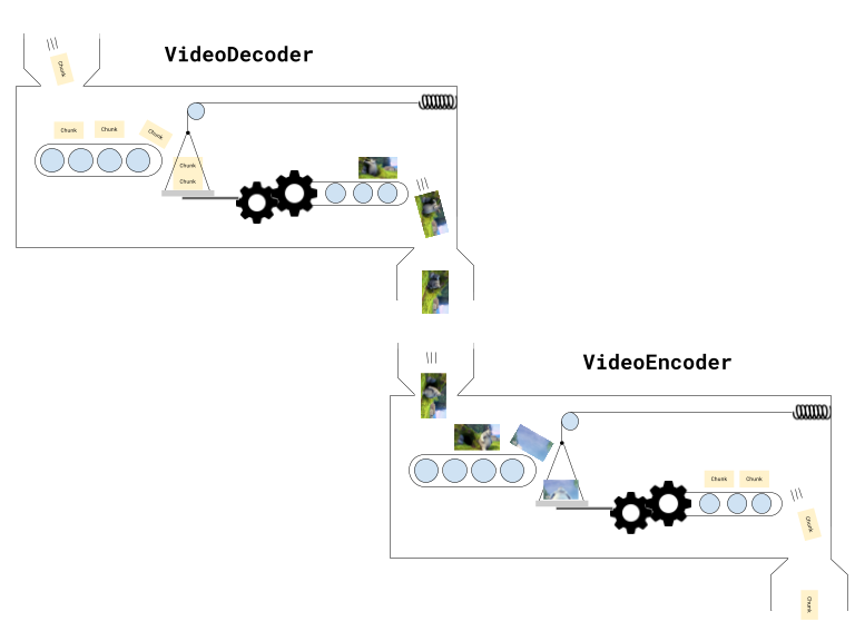 In reality, Video Decoders and Video Encoders are actually complex as they encode/decode complex interframe depdencies [6], but that’s hard to visualize, so I likened the encode/decode pipeline to a conveyer belt machine with complex mechanics as a visual metaphor.