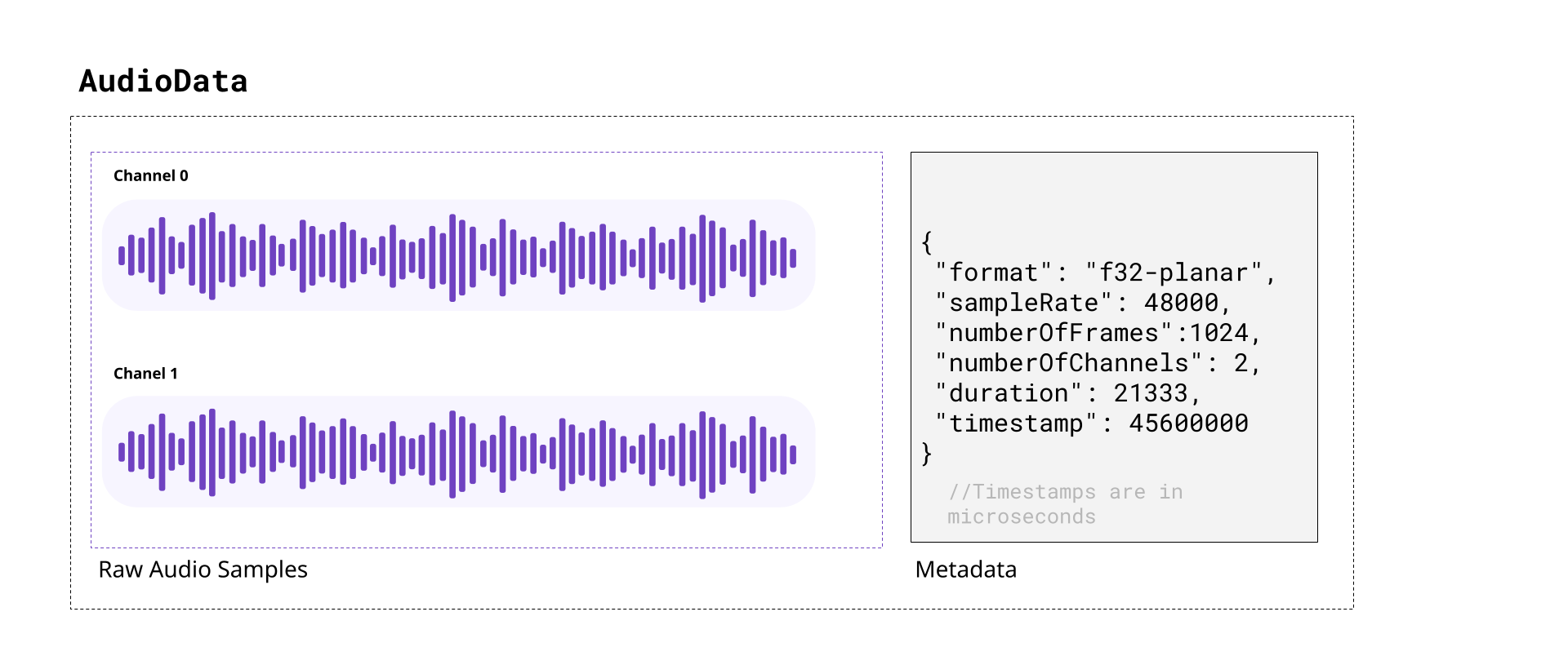 Section titled “How to write audio data”Two write audio data, you’d need to use AudioData constructor, format the input data as a Float32Array, and then specify the relevant metadata.